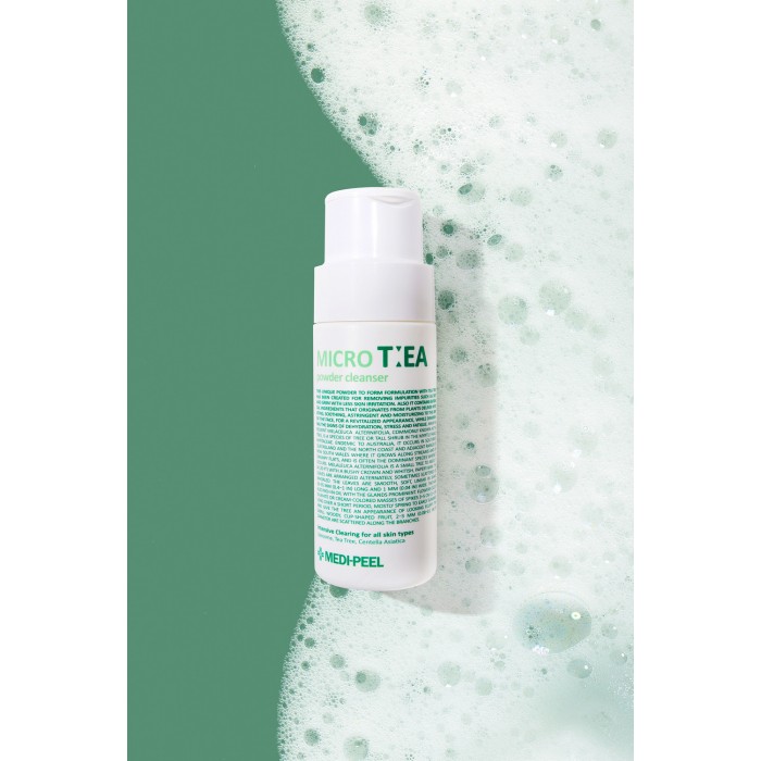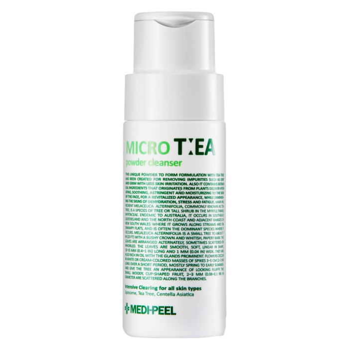 Глубокоочищающая энзимная пудра с чайным деревом Medi-Peel Micro Tea Powder Cleanser обеспечивает интенсивное очищение, не пересушивая кожу. Удаляет все виды загрязнений, пыль, излишки себума и стойкий макияж, растворяет сальные пробки, устраняет жирный блеск. Регулирует выработку кожного сала, сужает поры и выравнивает микрорельеф. Средство деликатно воздействует на поверхность кожи, эффективно очищает поры, осветляет темные точки и отшелушивает омертвевшие клетки. Препятствует появлению покраснений и раздражений, уменьшает очаги воспаления, успокаивает кожу, улучшает ее тон. Несмотря на активное очищающее действие не сушит кожу, поддерживает естественный гидролипидный баланс, увлажняет и не допускает обезвоженности. Энзимная пудра представляет собой мельчайший порошок, который при контакте с водой взбивается в пышную пену. Обладает слабо-кислым уровнем pH 5.5, 100% веганский продукт.