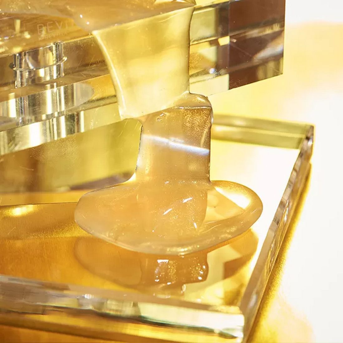 Плёночная очищающая маска с золотыми частицами. Она эффективно отшелушивает ороговевшие клетки, вытягивает сальные пробки, выводит шлаки и токсины, придаёт лицу свежий и ухоженный вид. Экстракт мёда активизирует регенерацию тканей, гармонизирует микрофлору, способствует заживлению повреждений, успокаивает раздражения, выводит шлаки и пробуждает иммунитет. Экстракт камелии играет мощную антиоксидантную роль. Он отражает напор свободных радикалов, защищает клетки от окислительного стресса, предотвращает разрушение тканей и замедляет процесс старения. Пантенол стимулирует заживление тканей, успокаивает воспаления и оберегает кожу от негативных внешних воздействий. Аллантоинтотшелушивает ороговевшие клетки, снимает раздражение и зуд, предотвращает образование комедонов и сальных пробок. Экстракты ромашки, розмарина, лаванды, жасмина, чабреца, шалфея и других успокаивающих растений, которые борются с раздражениями, насыщают ткани ценными микроэлементами и укрепляют здоровье кожи. Коллоидное золото стимулирует метаболические процессы в тканях, улучшает кровообращение, выводит шлаки, восстанавливает эластичность и упругость дермы.